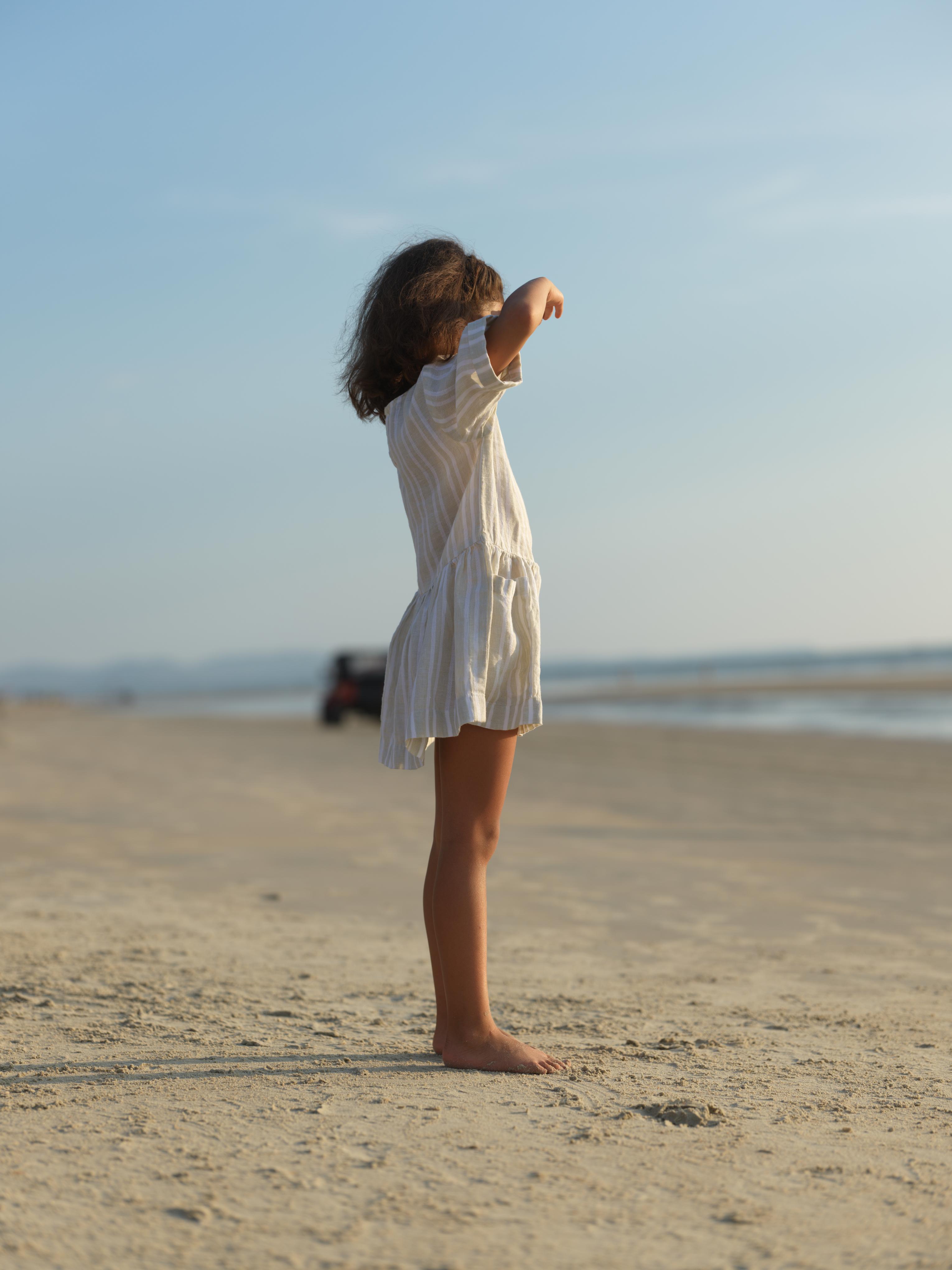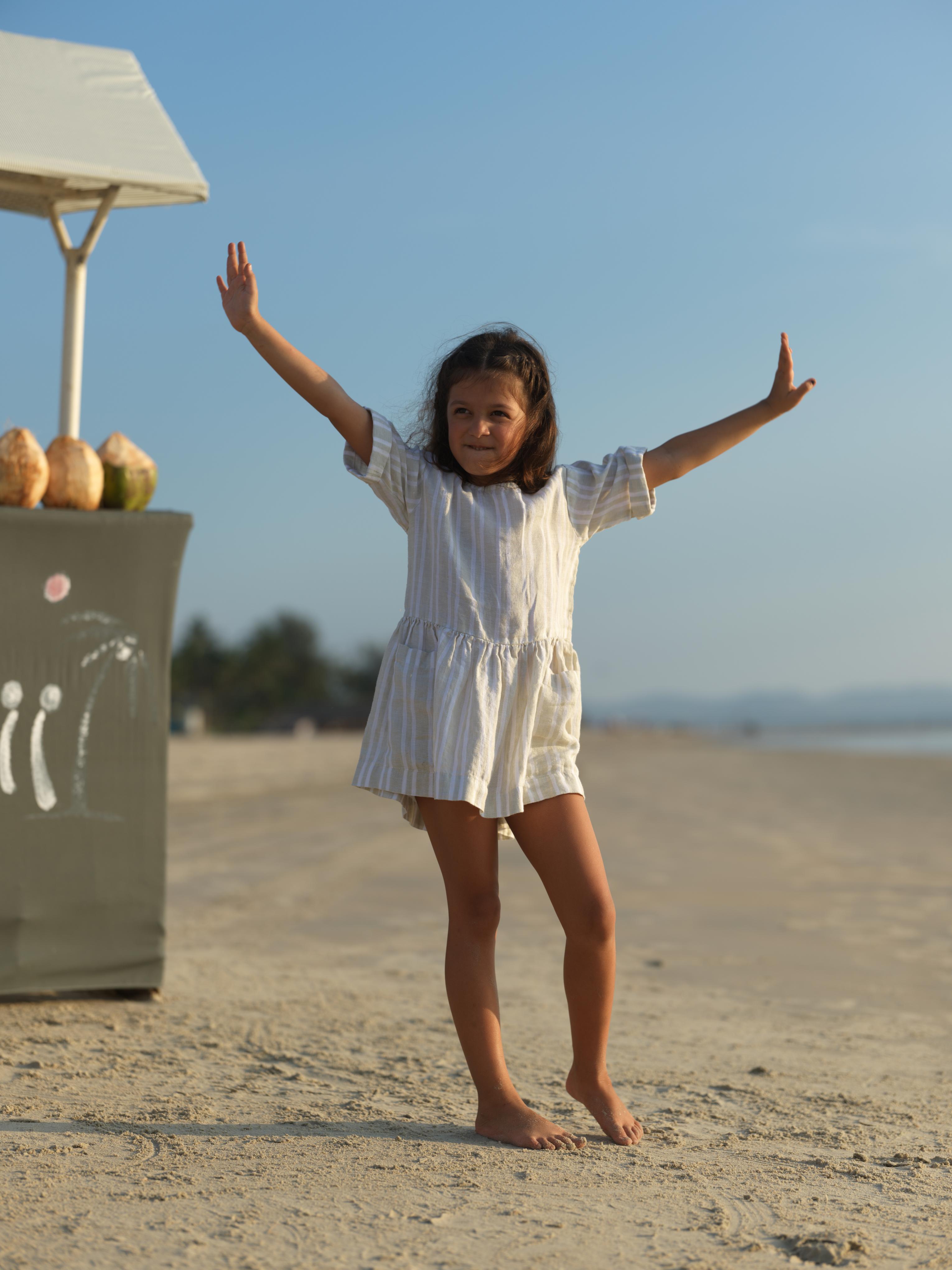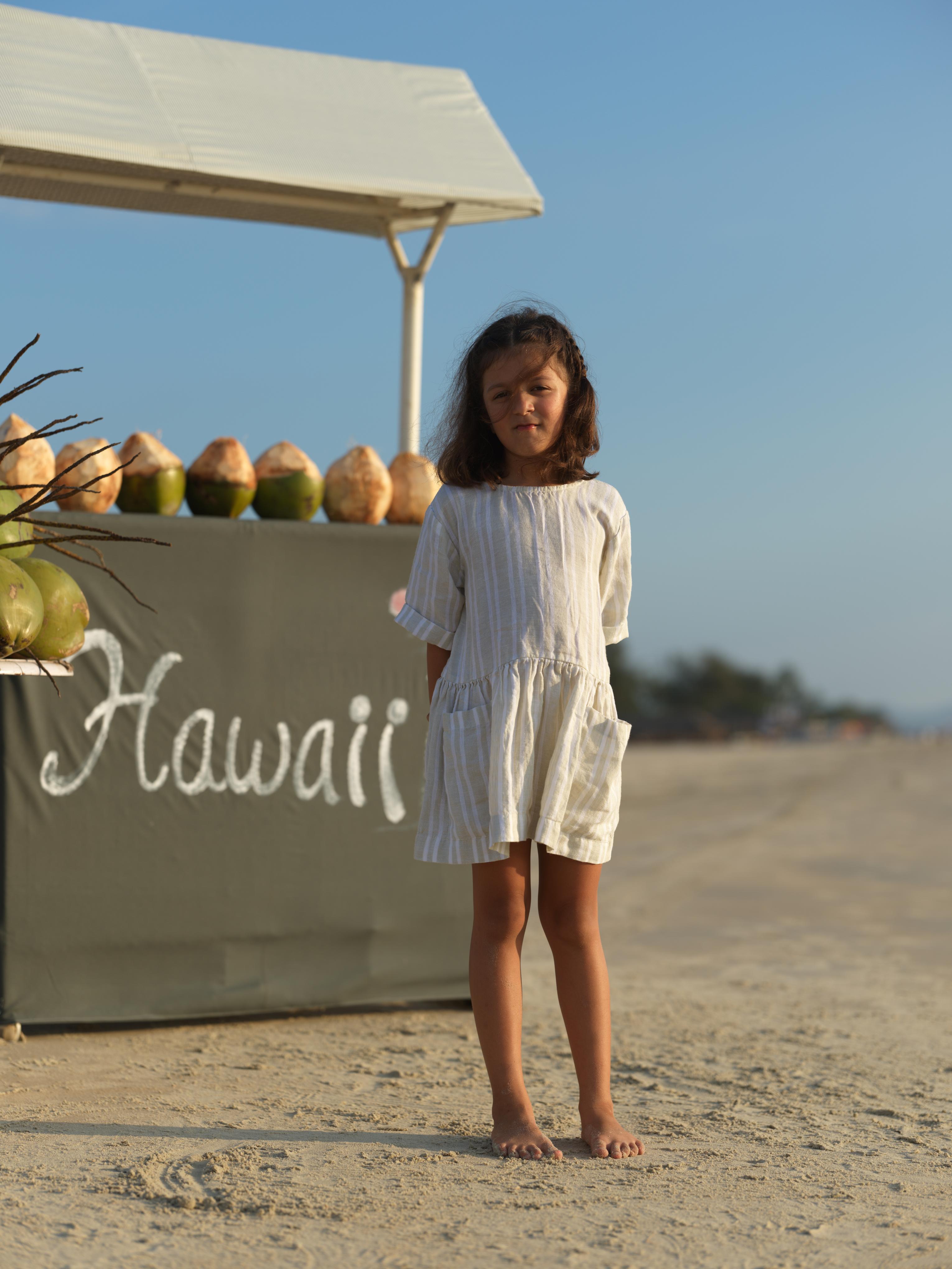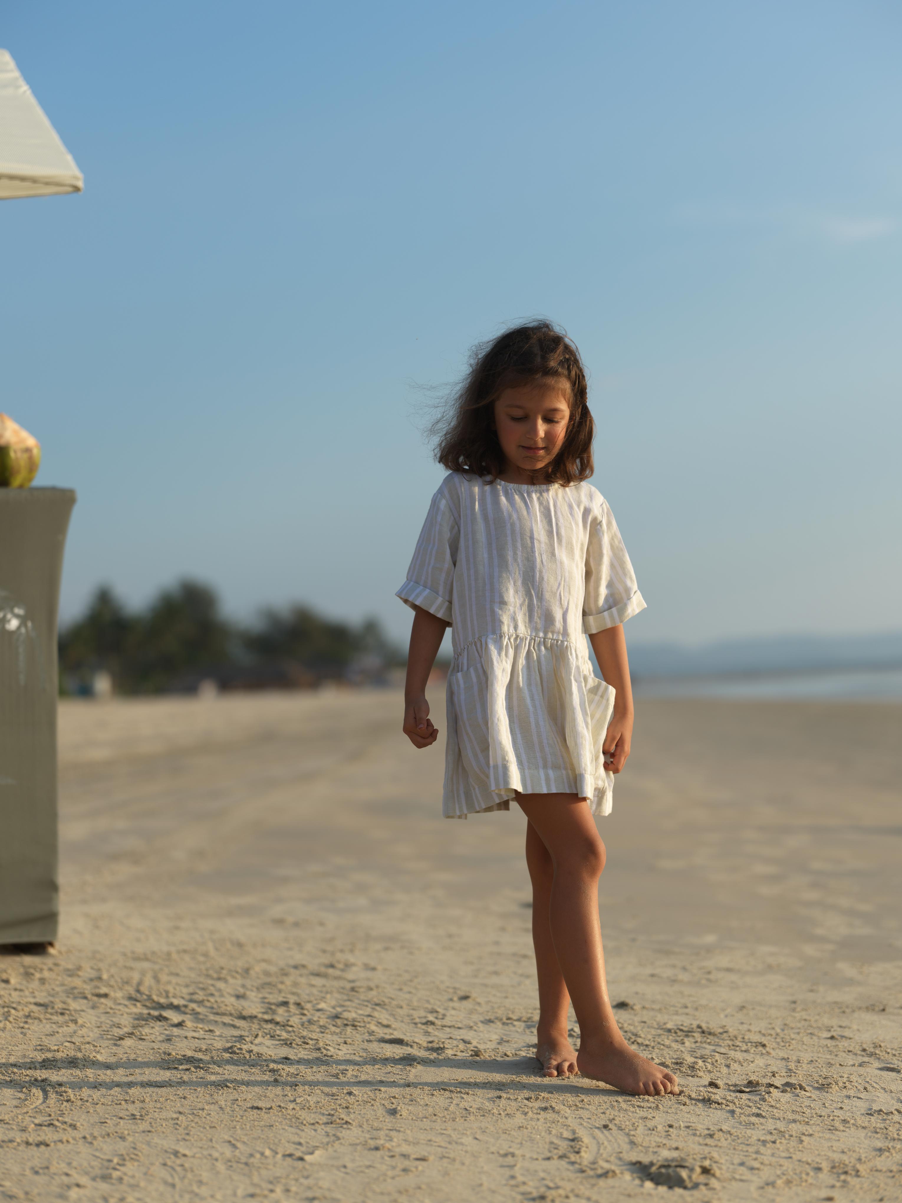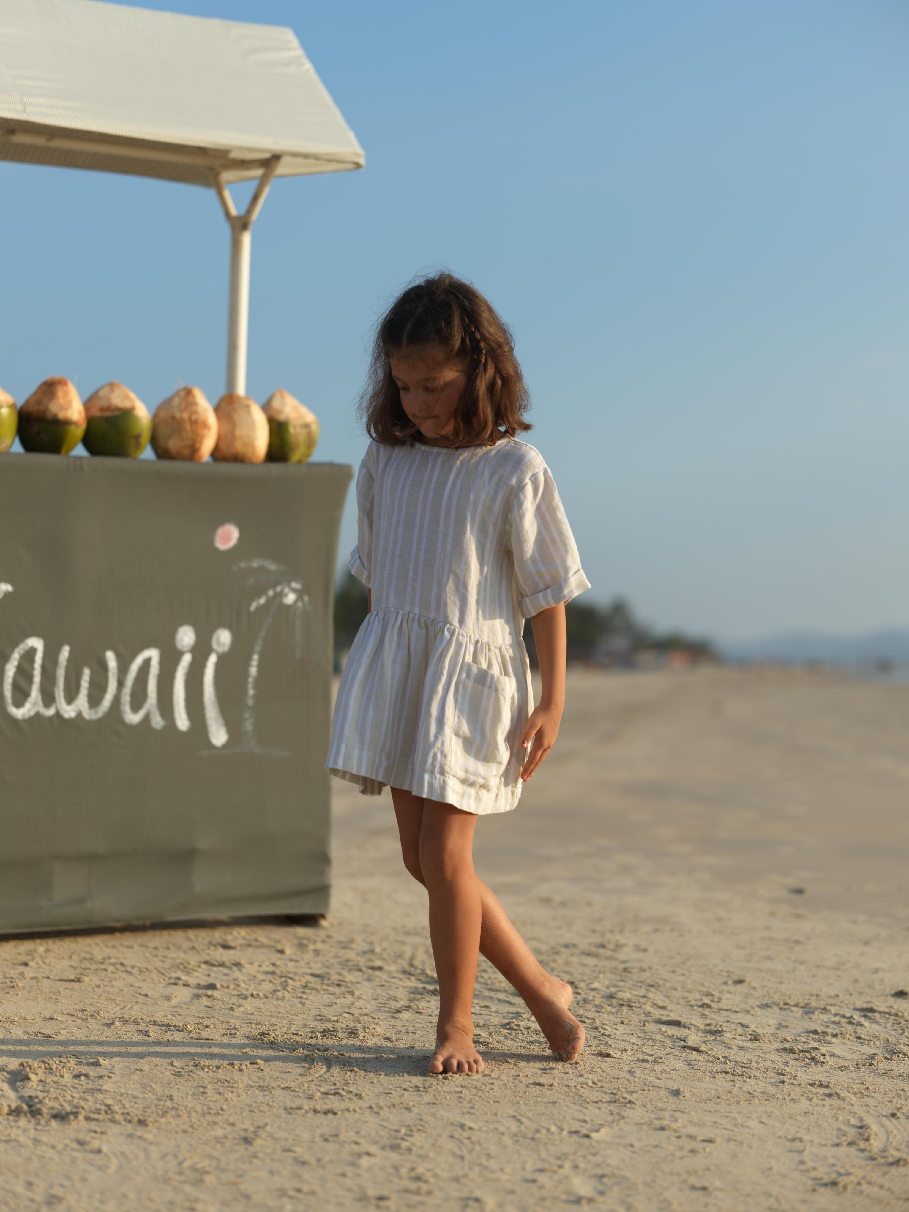 Girl Patch Pocket Drop Shoulder Dress Beige Double Stripe