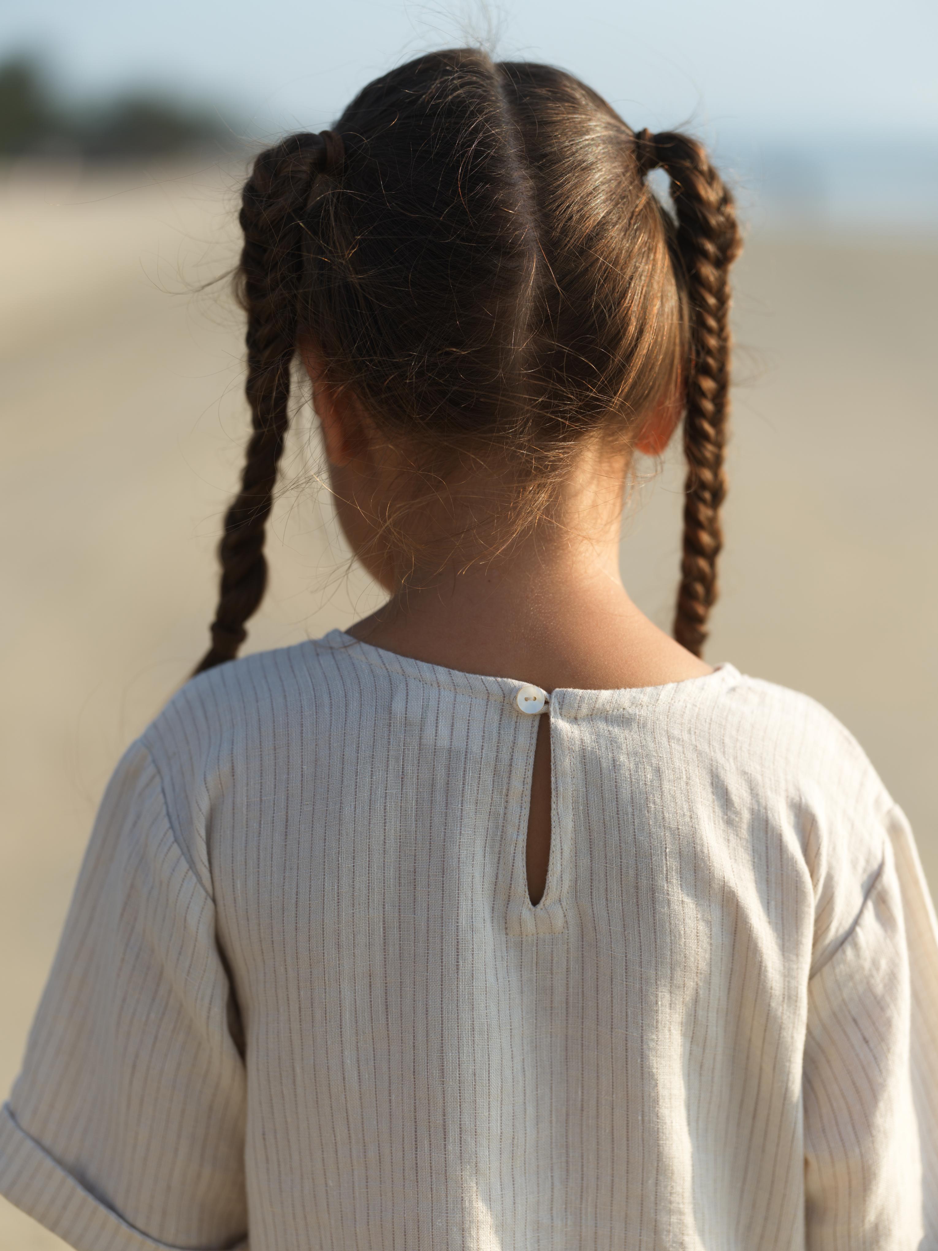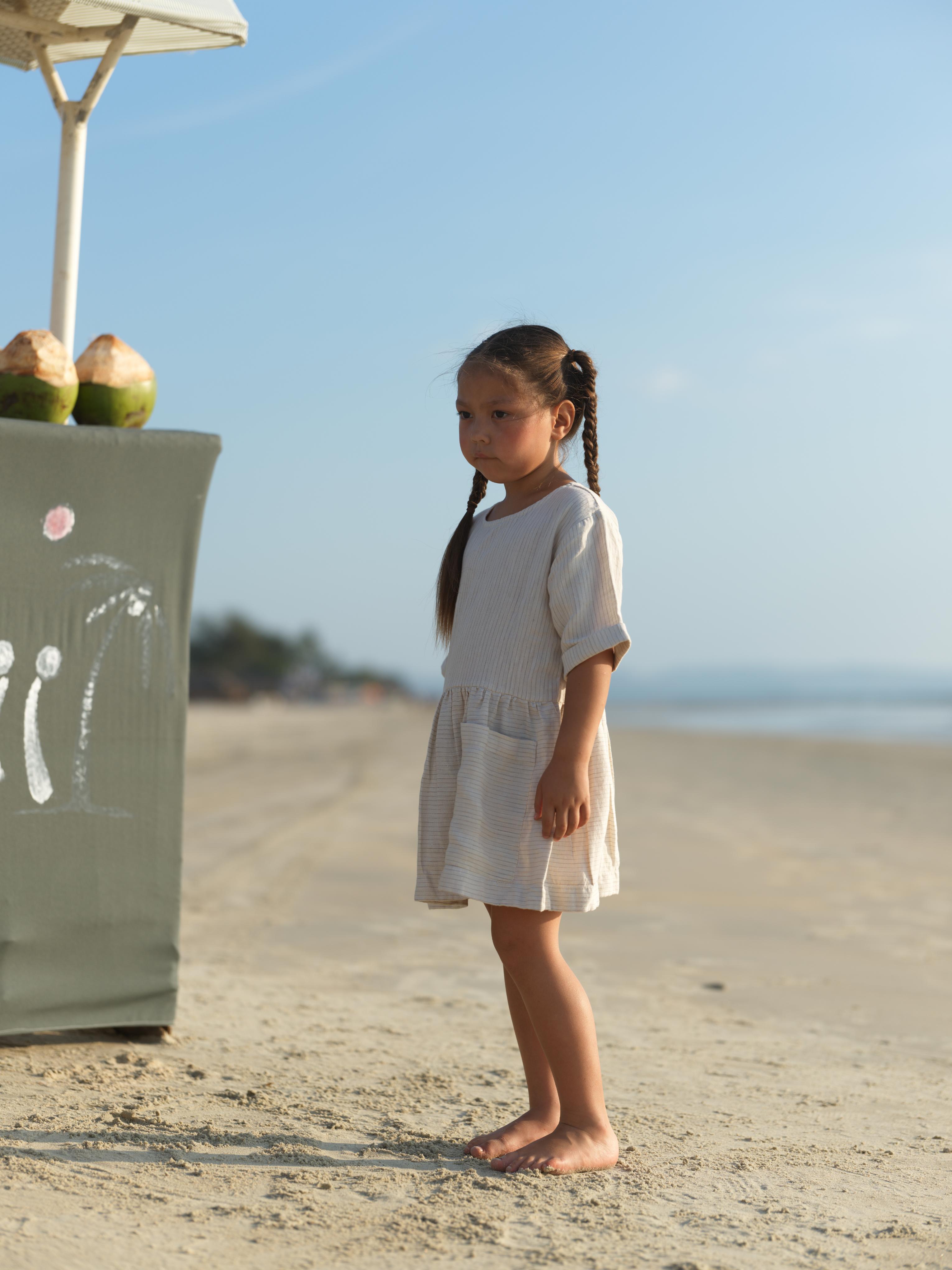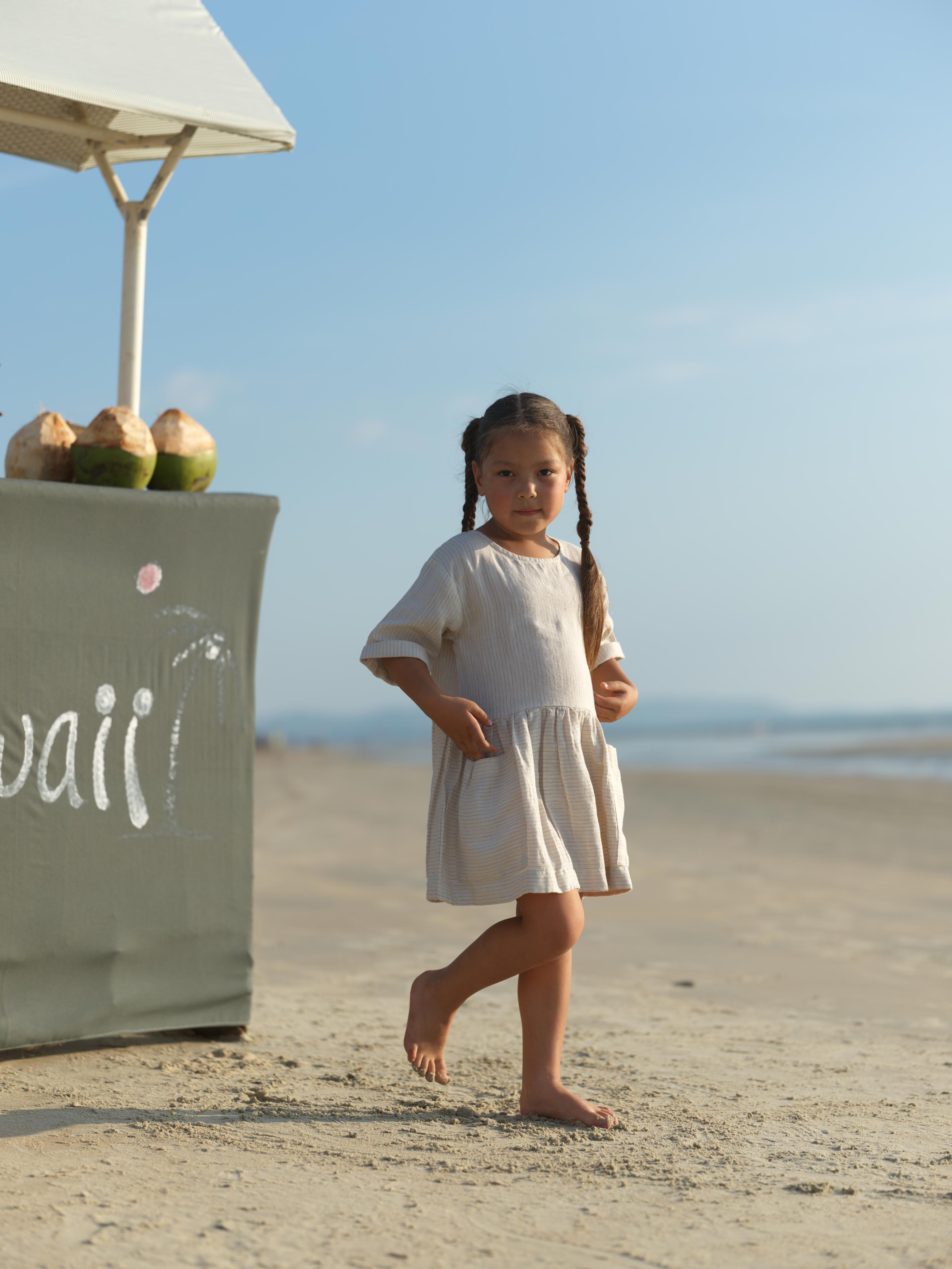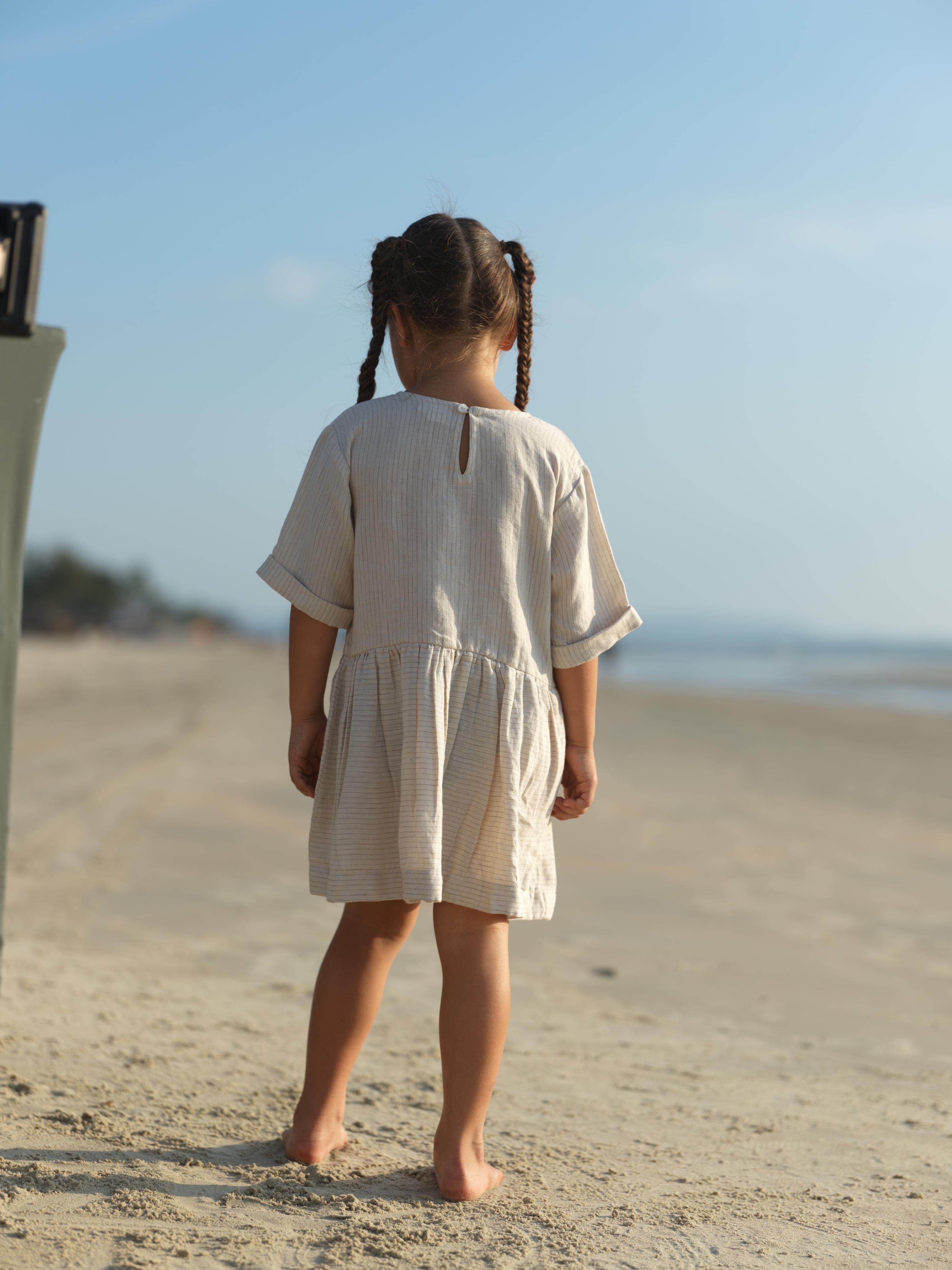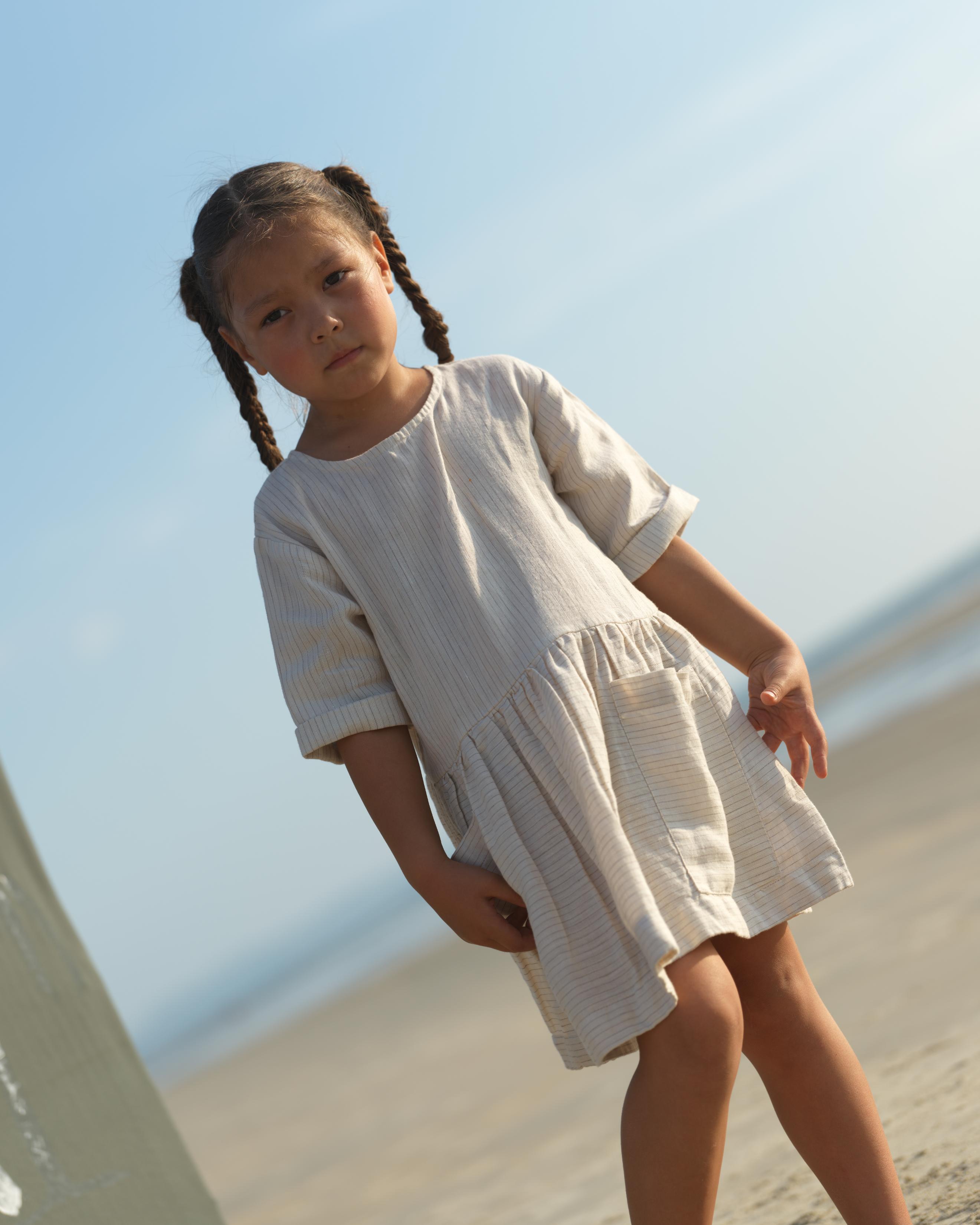 Girl Patch Pocket Drop Shoulder Dress Beige Lines