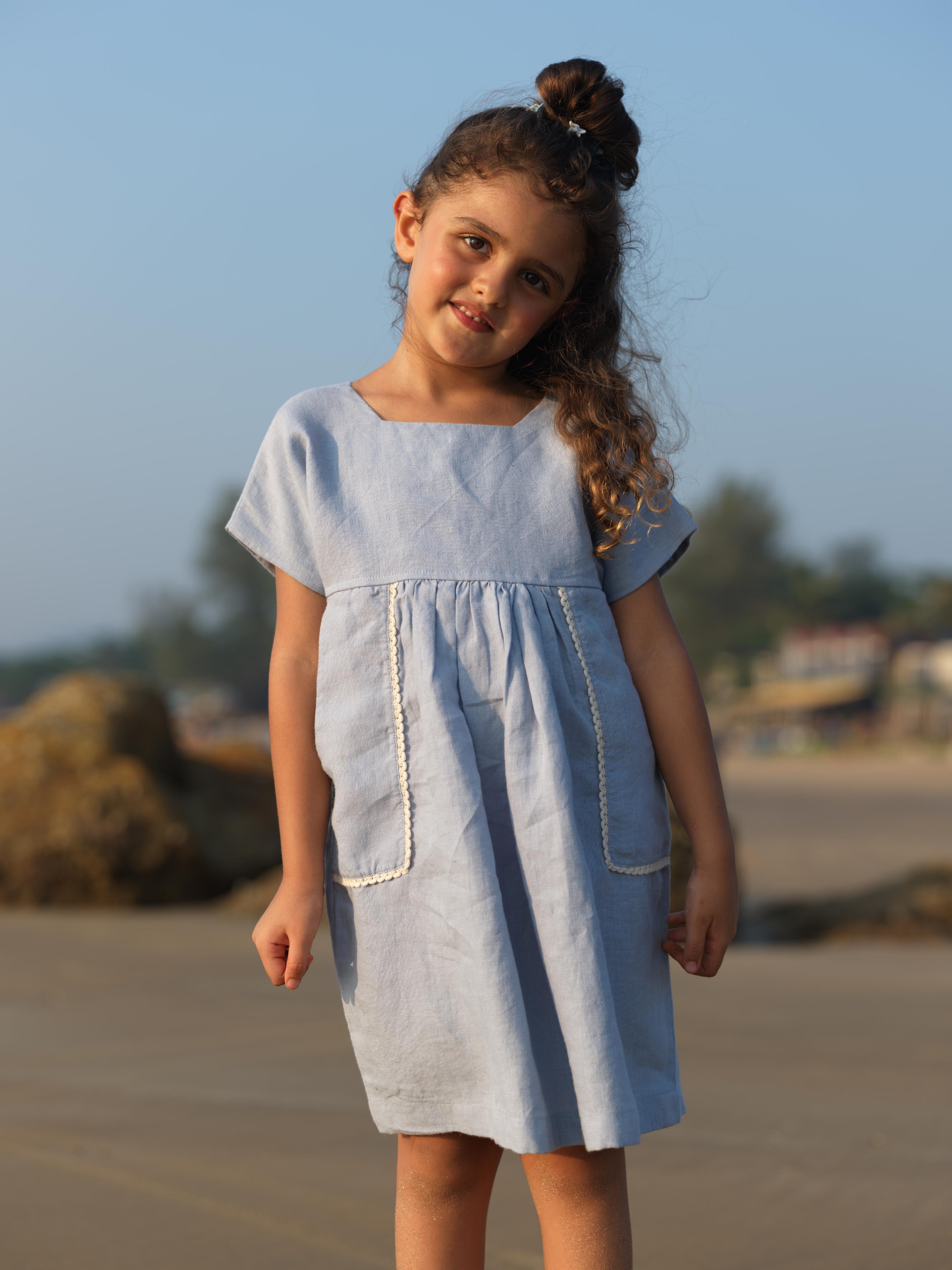 Girls Patch Pocket Tie-Back Dress Pacific Blue