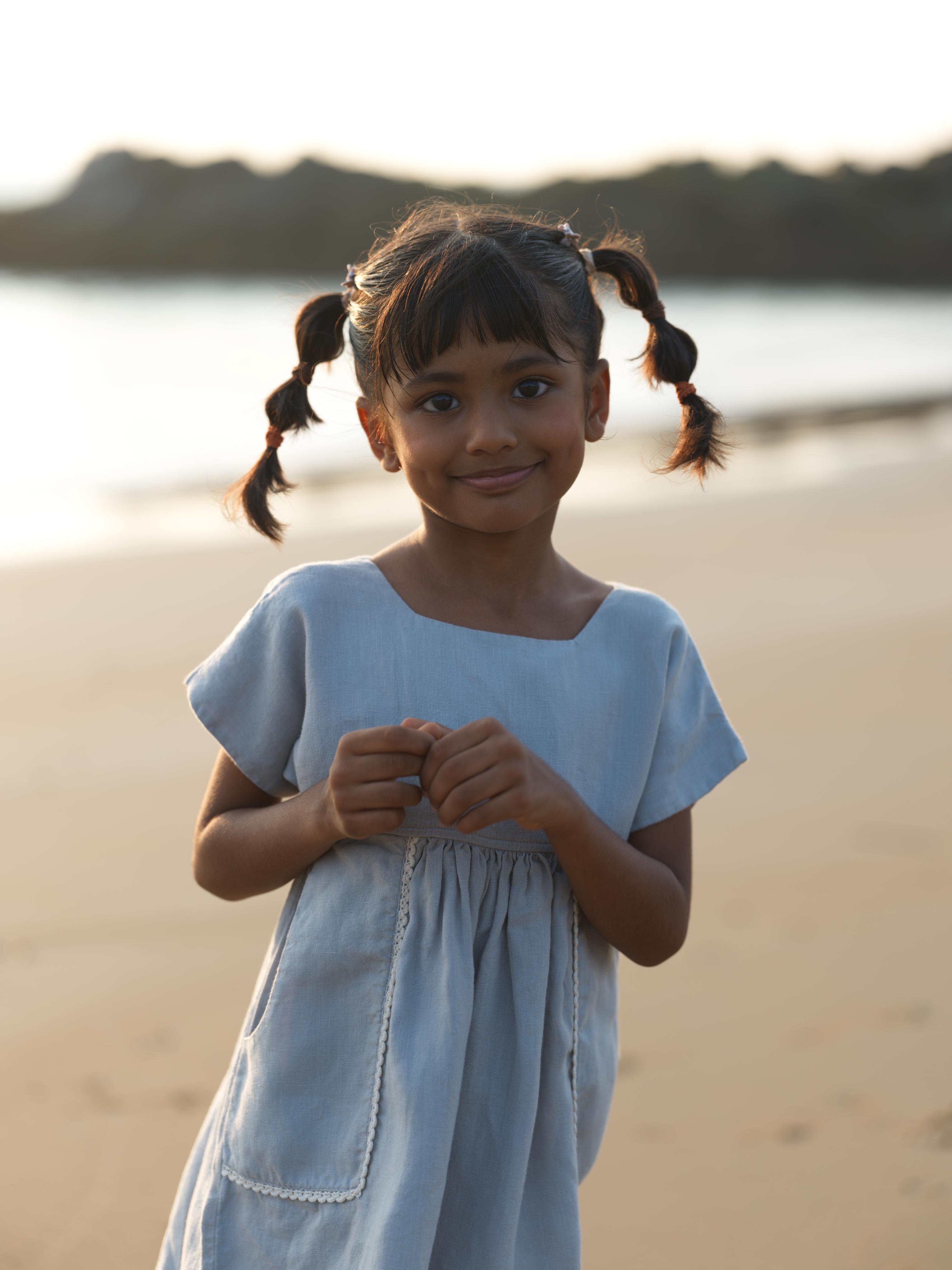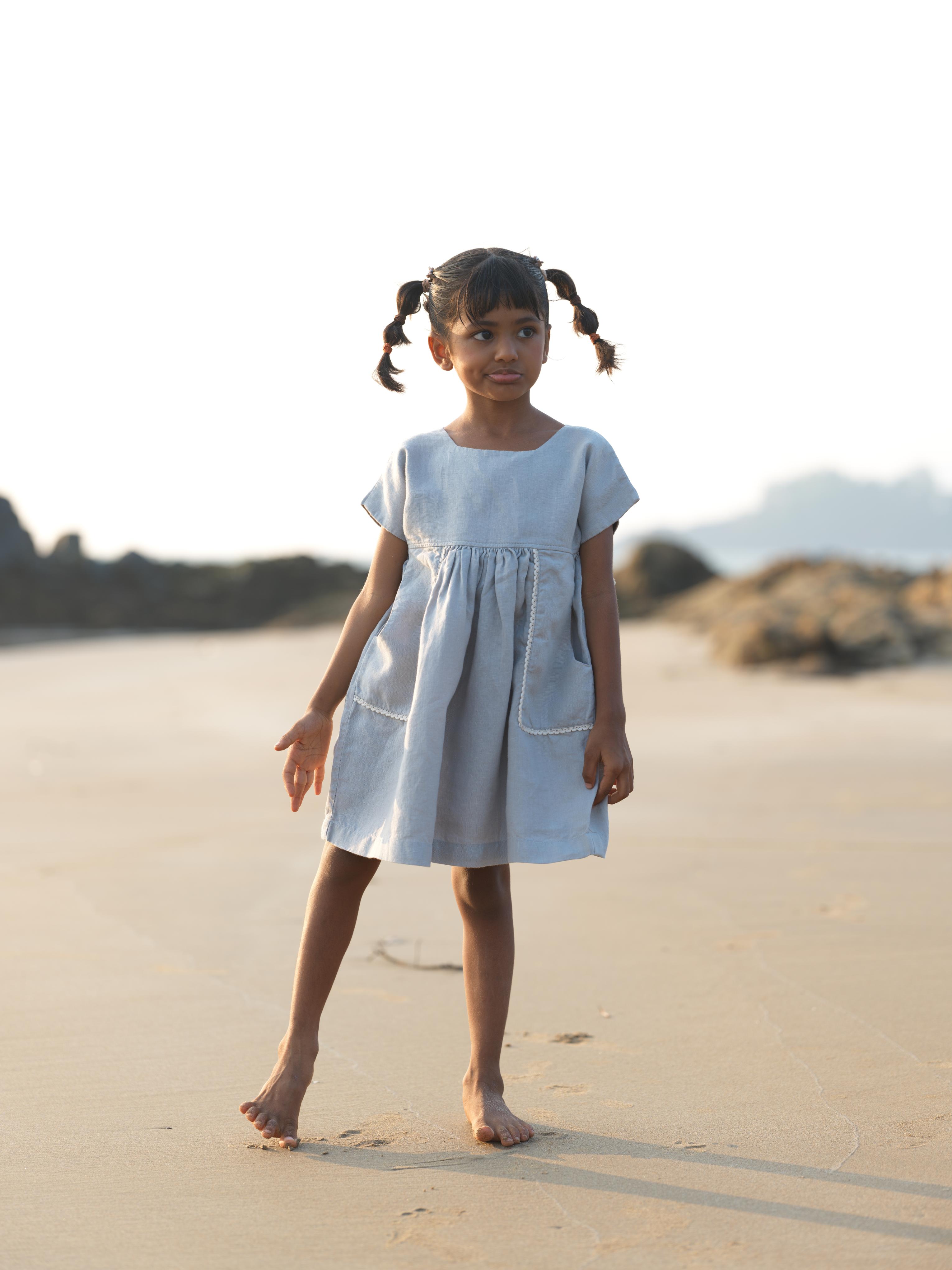 Girls Patch Pocket Tie-Back Dress Natural