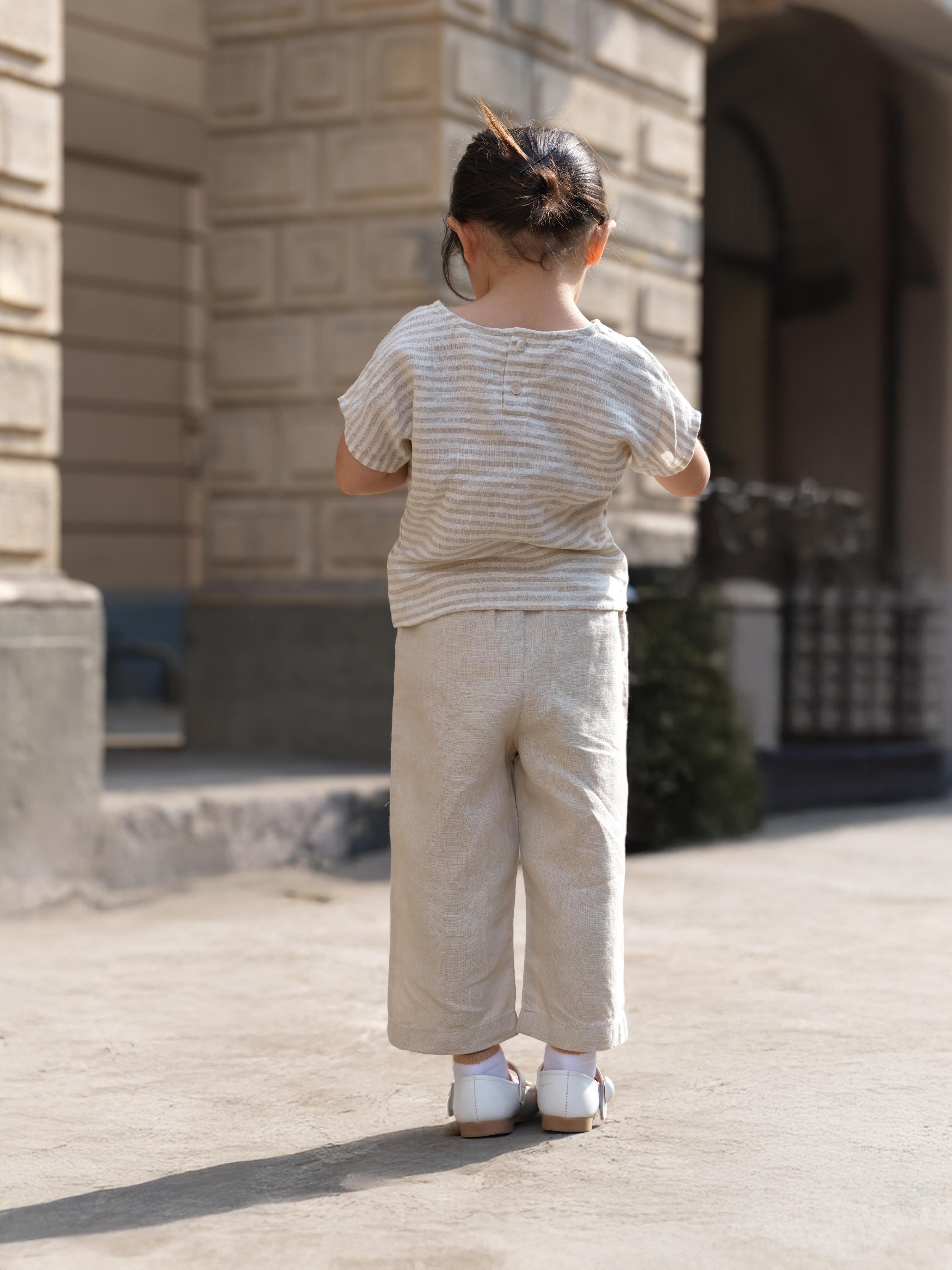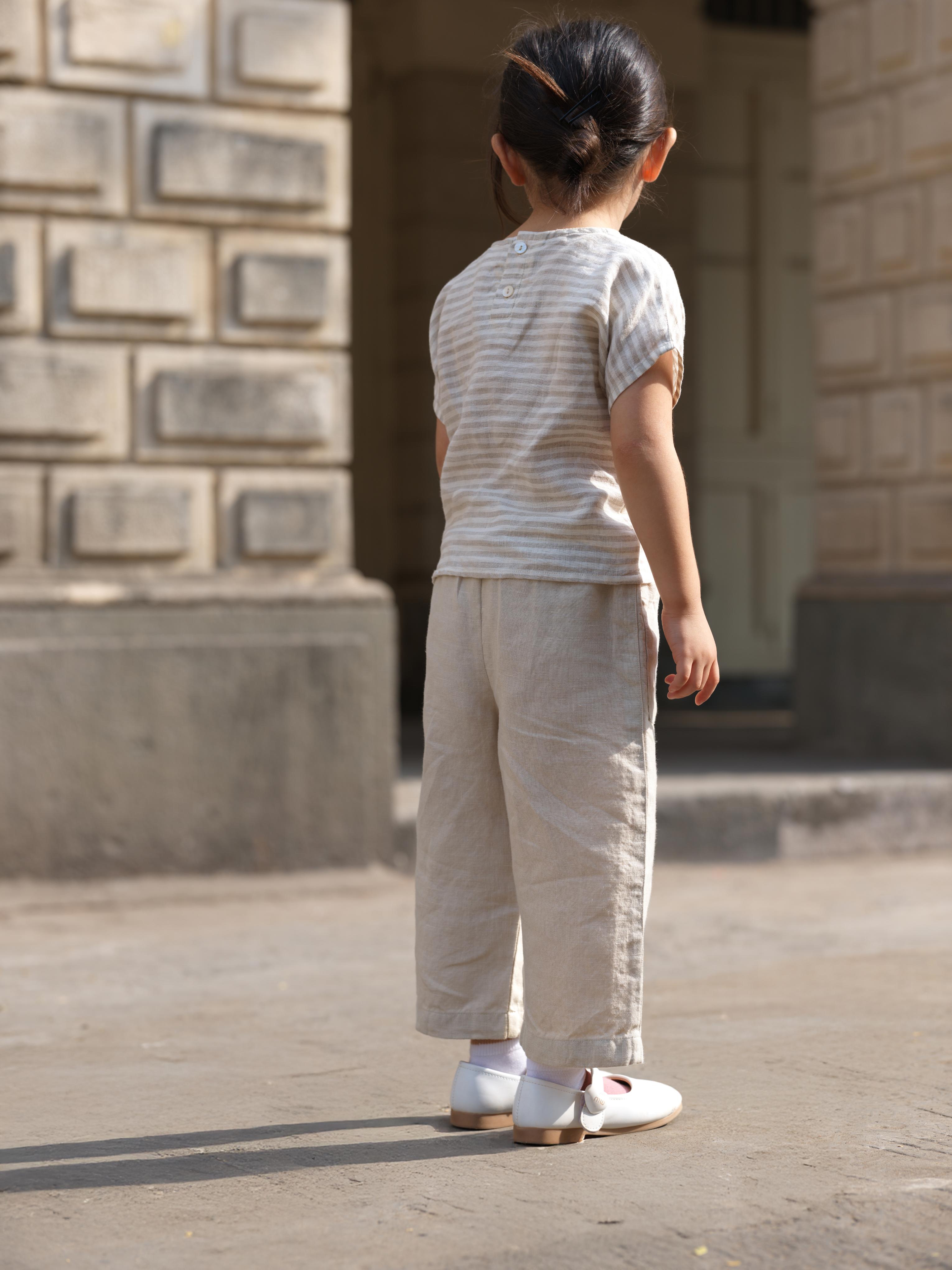 Girls Round Shoulder Top & Patch pocket Trousers Co-Ord set Beige Stripes / Oatmeal