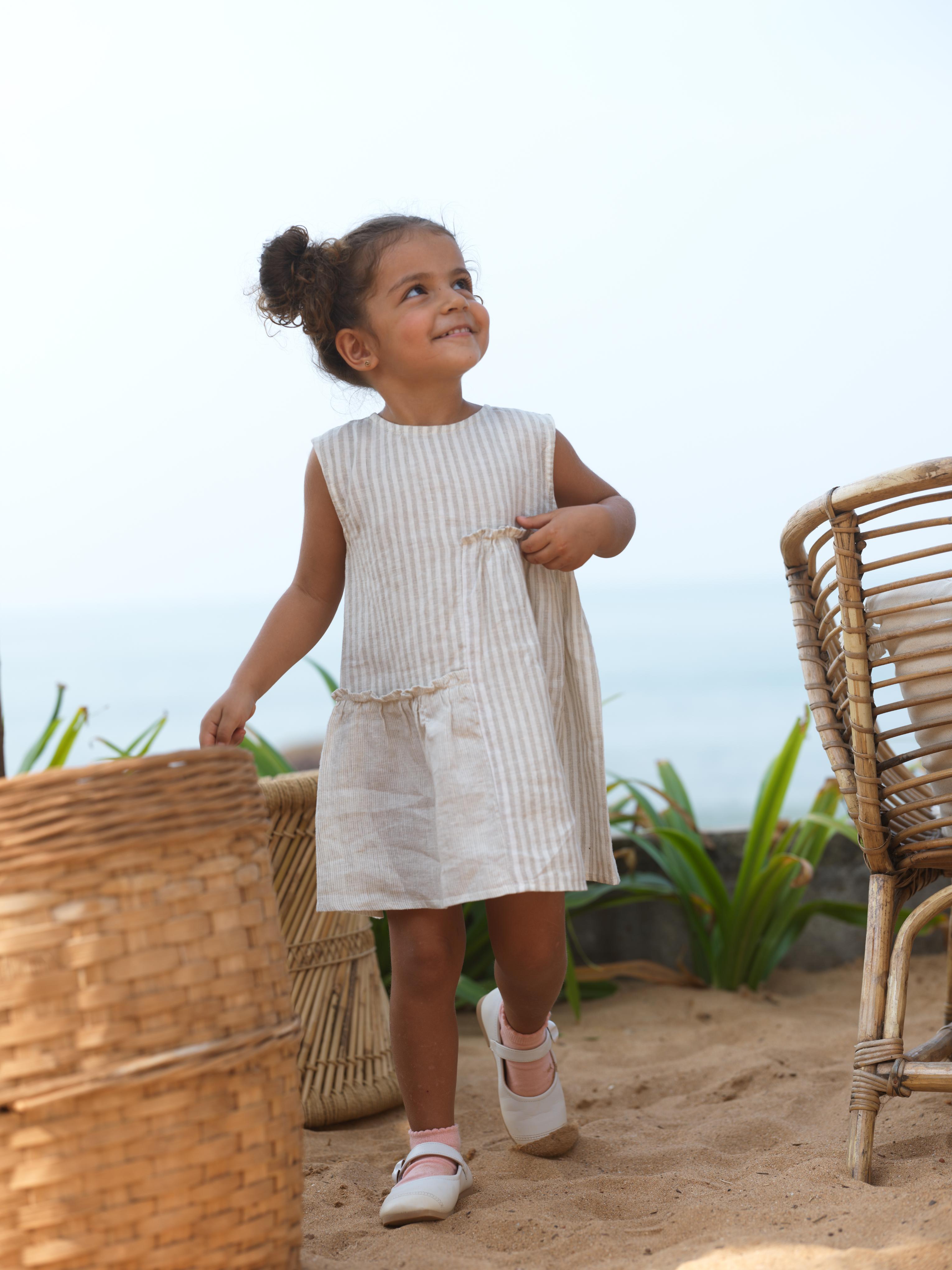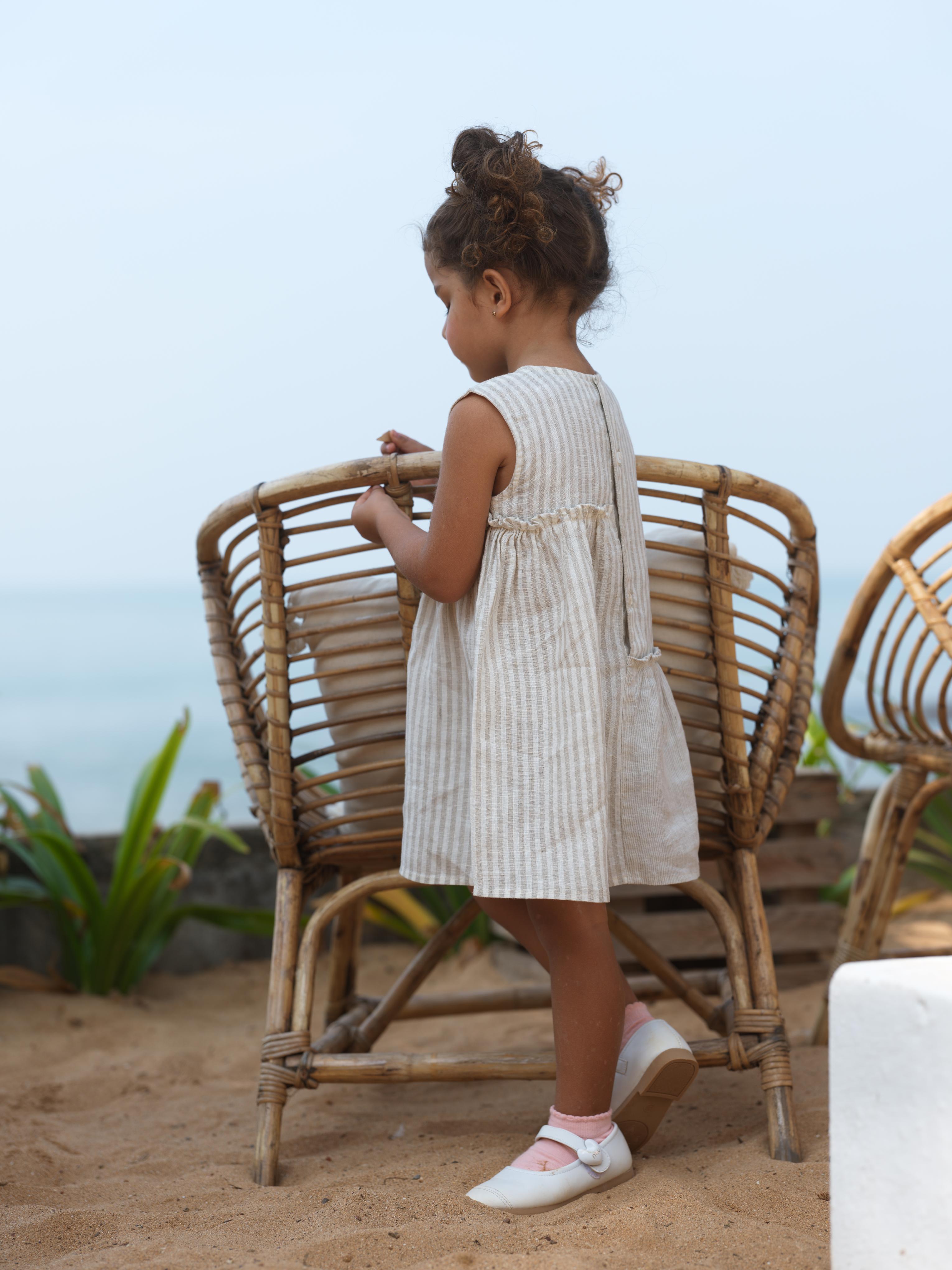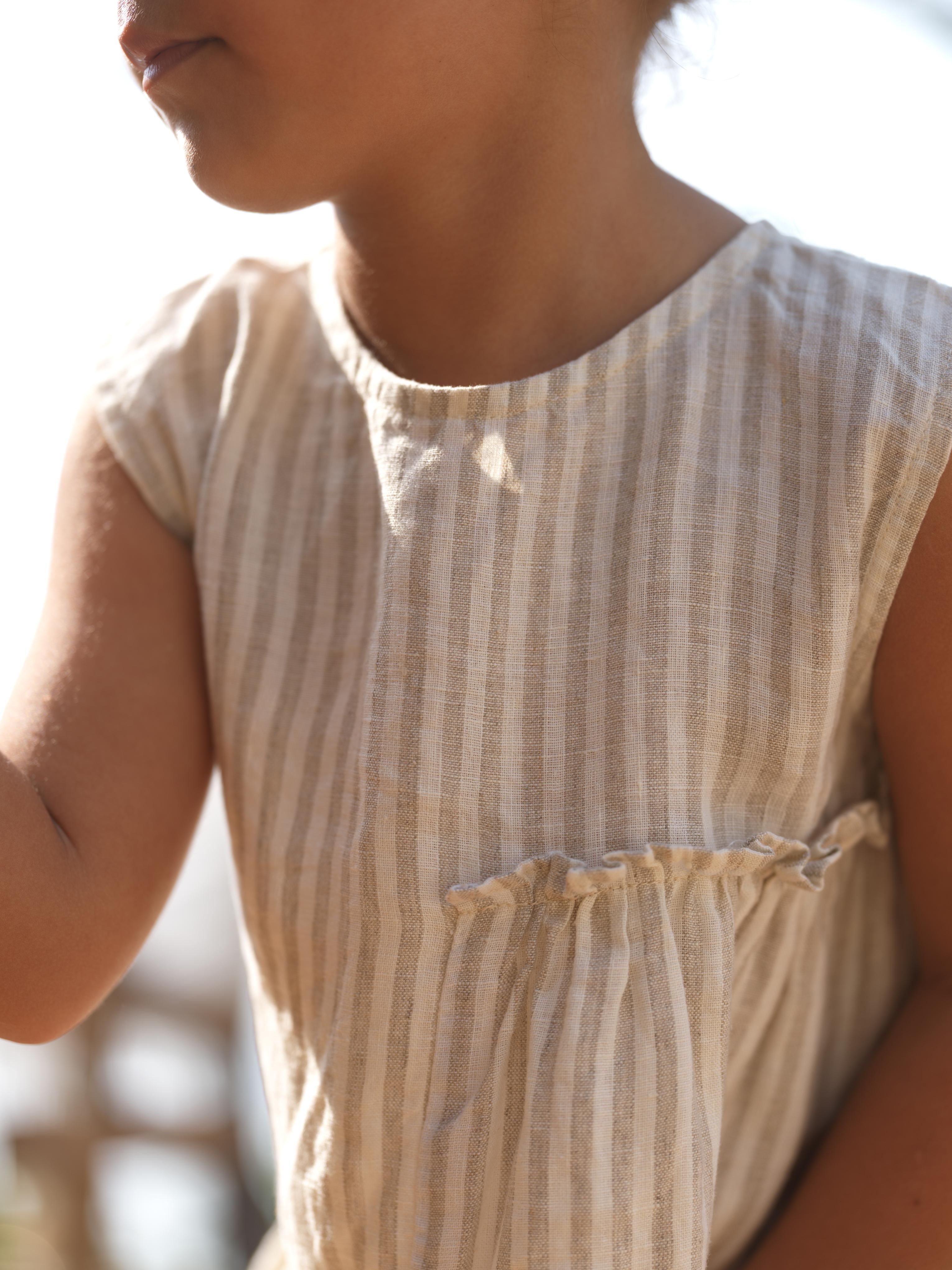 Girls Sleeveless Gathered Dress Beige Stripes / Fade Fine Stripe