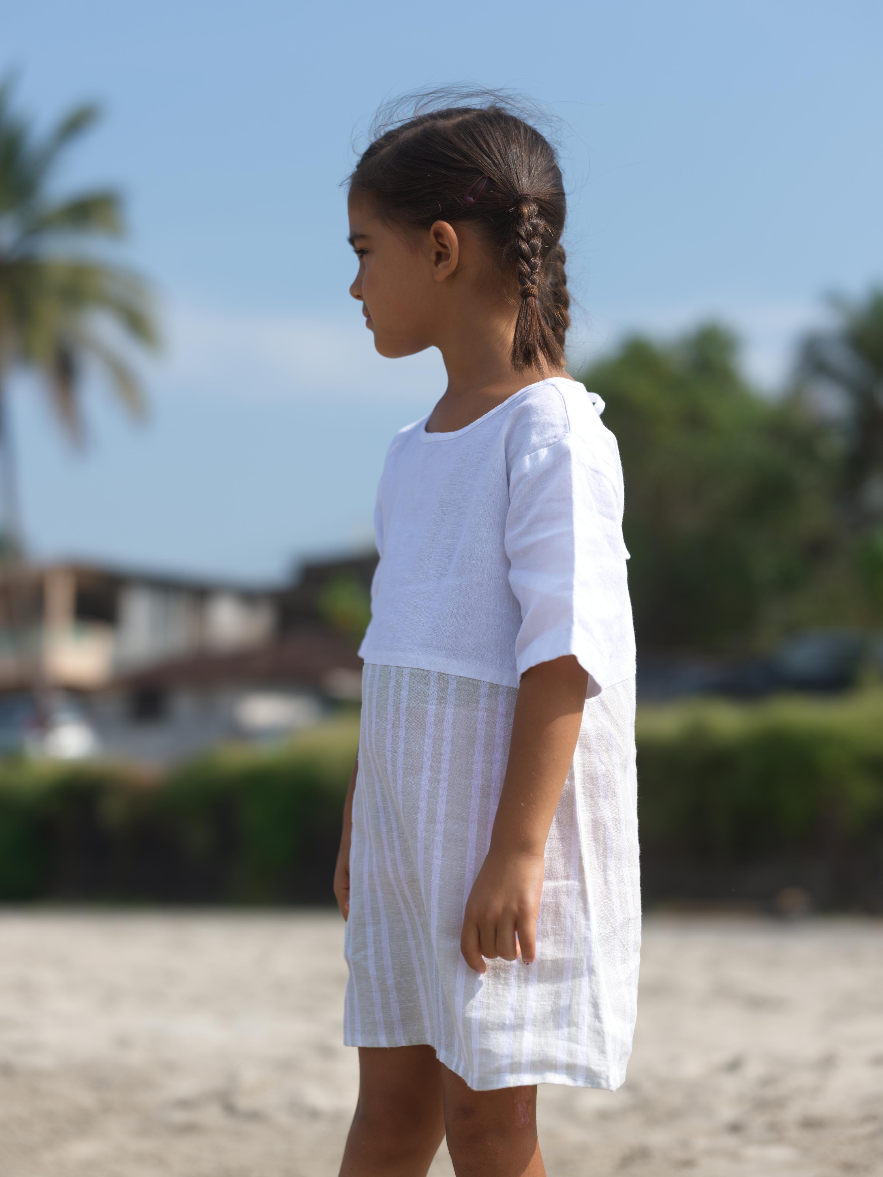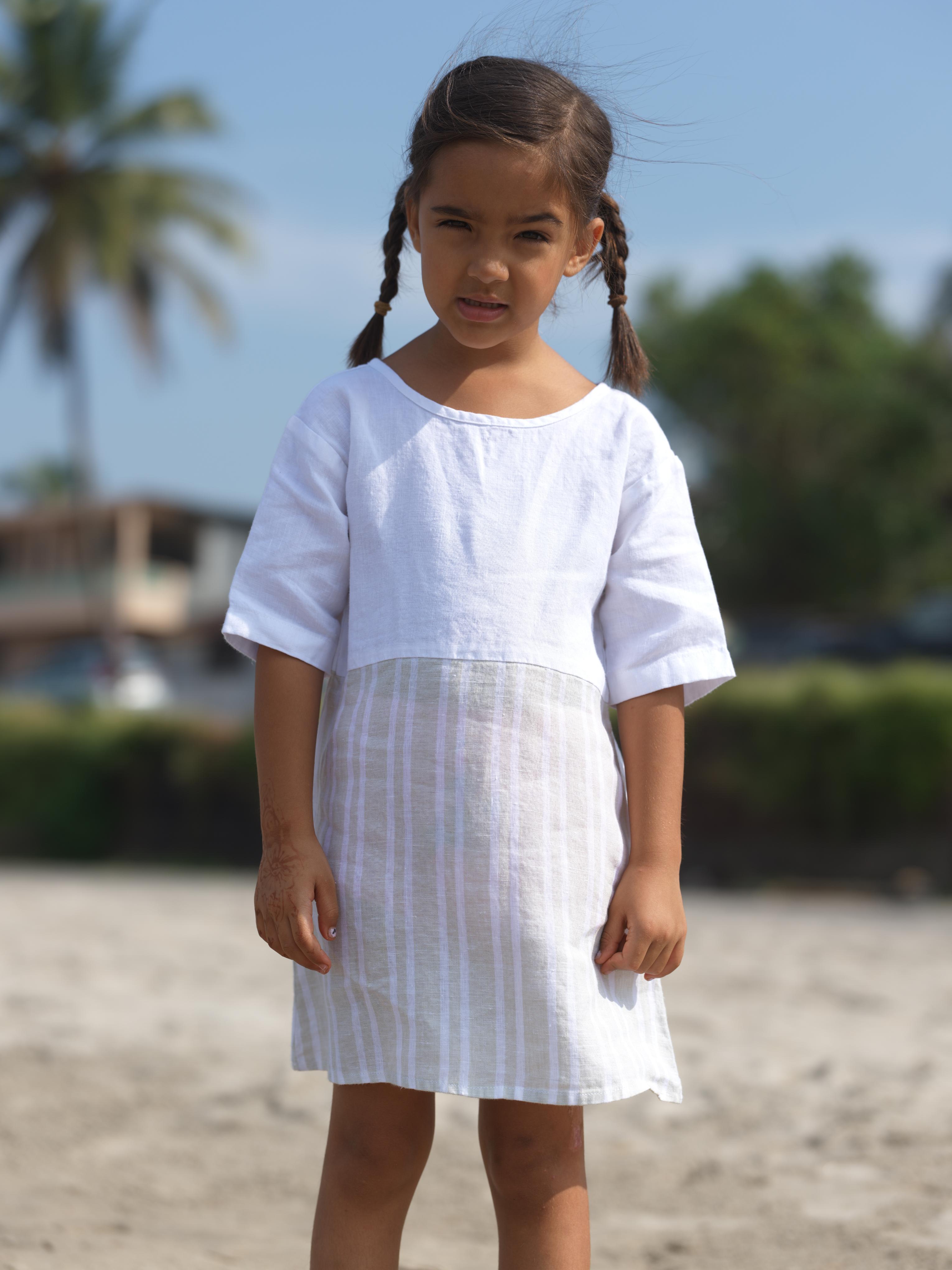 Girls Two Colour Casual Dress Beige Double Stripe / White