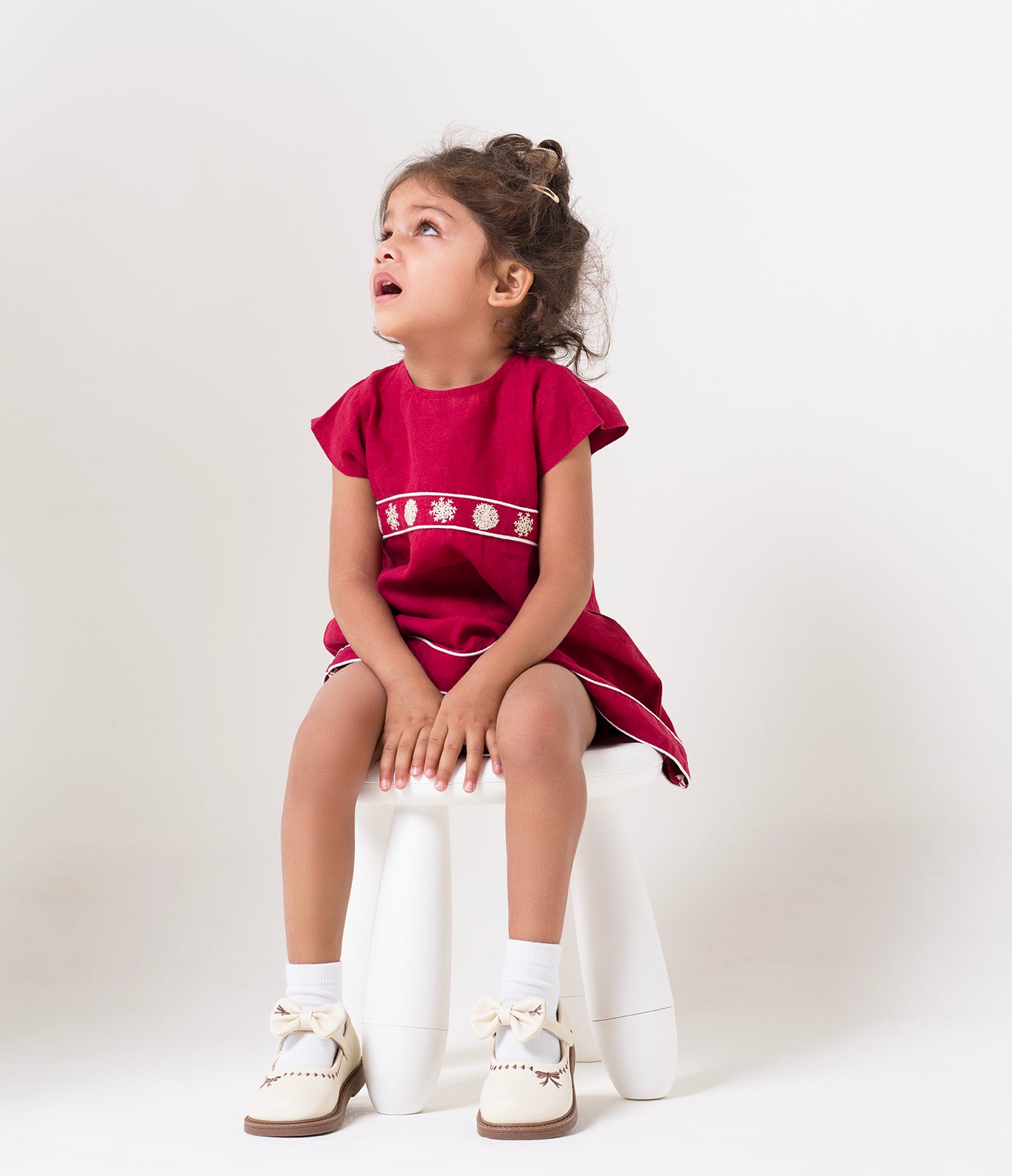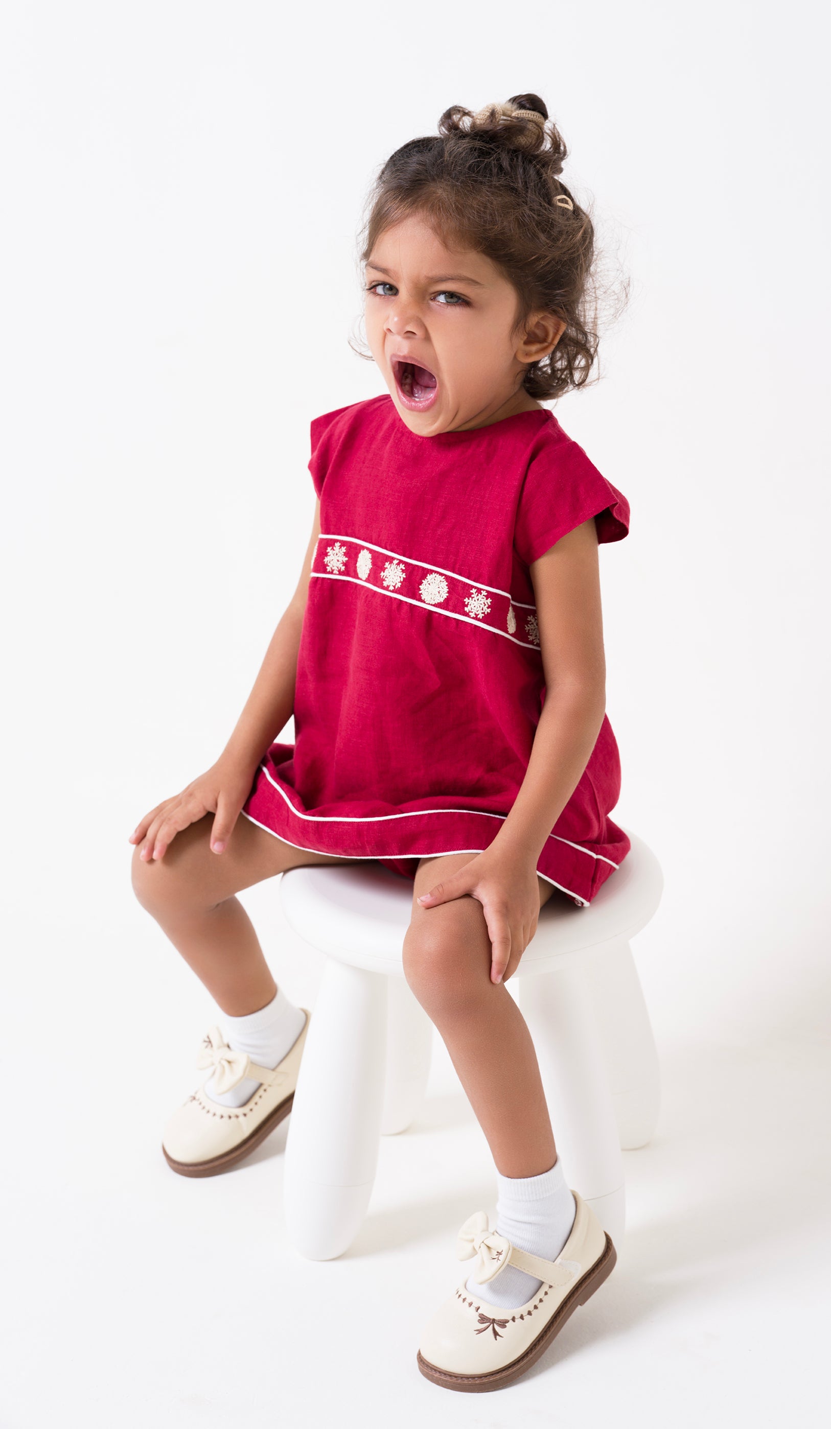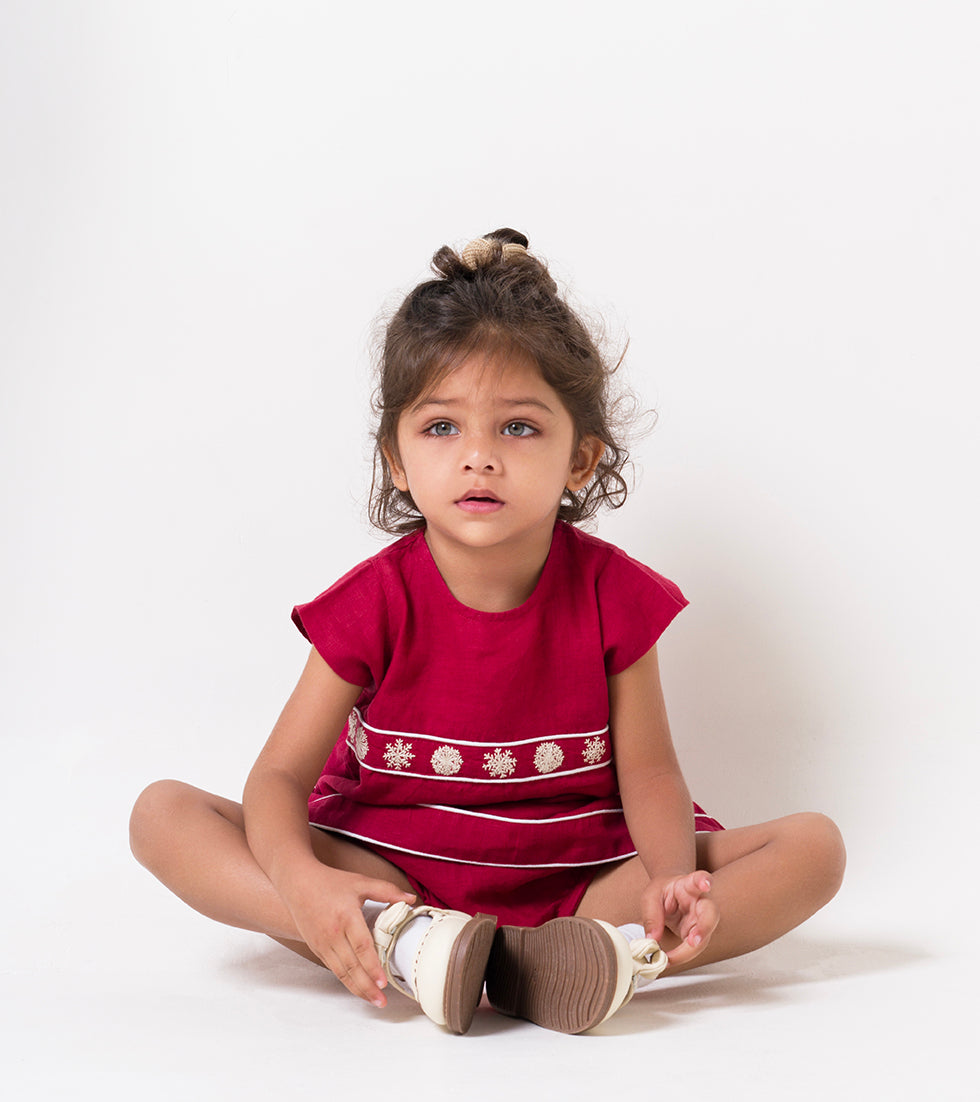 Let your little one claim centre stage in the Christmas collections pure linen dress, evoking both playfulness and sophistication. Each hand-embroidered by our artisans, the intricate snowflakes set on the designs cap-sleeved bodice lend the dress a cold-weather feel thats especially perfect for festive occasions. Framed by contrast piping and accompanied by tonal, elasticated bloomers, the dress is equally eye-catching and comfortable, whether paired with pointelle tights or styled with ruffled socks.
