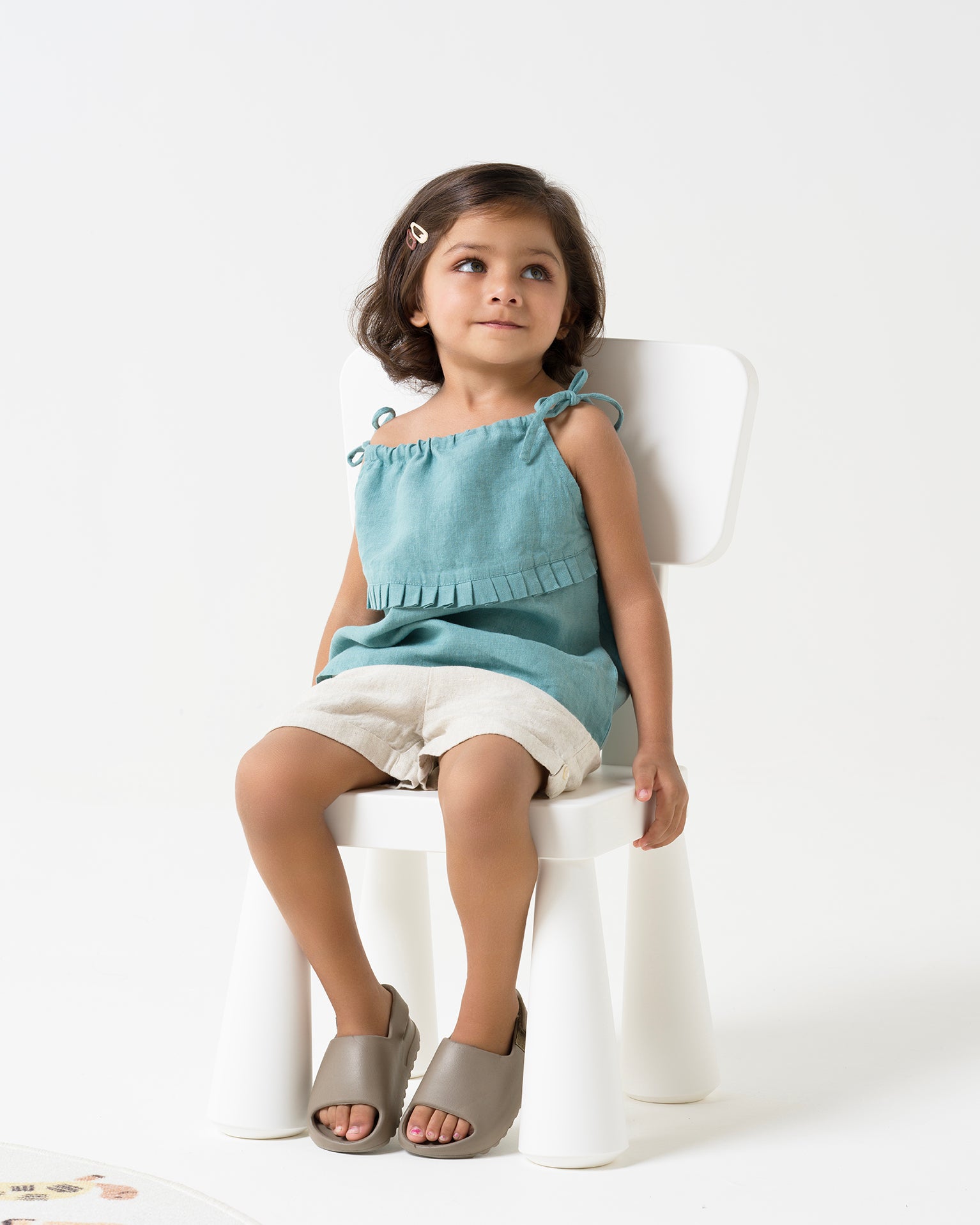Linen tie strap pleated co-ords set T - Pine Green - B - Cookie & Cream