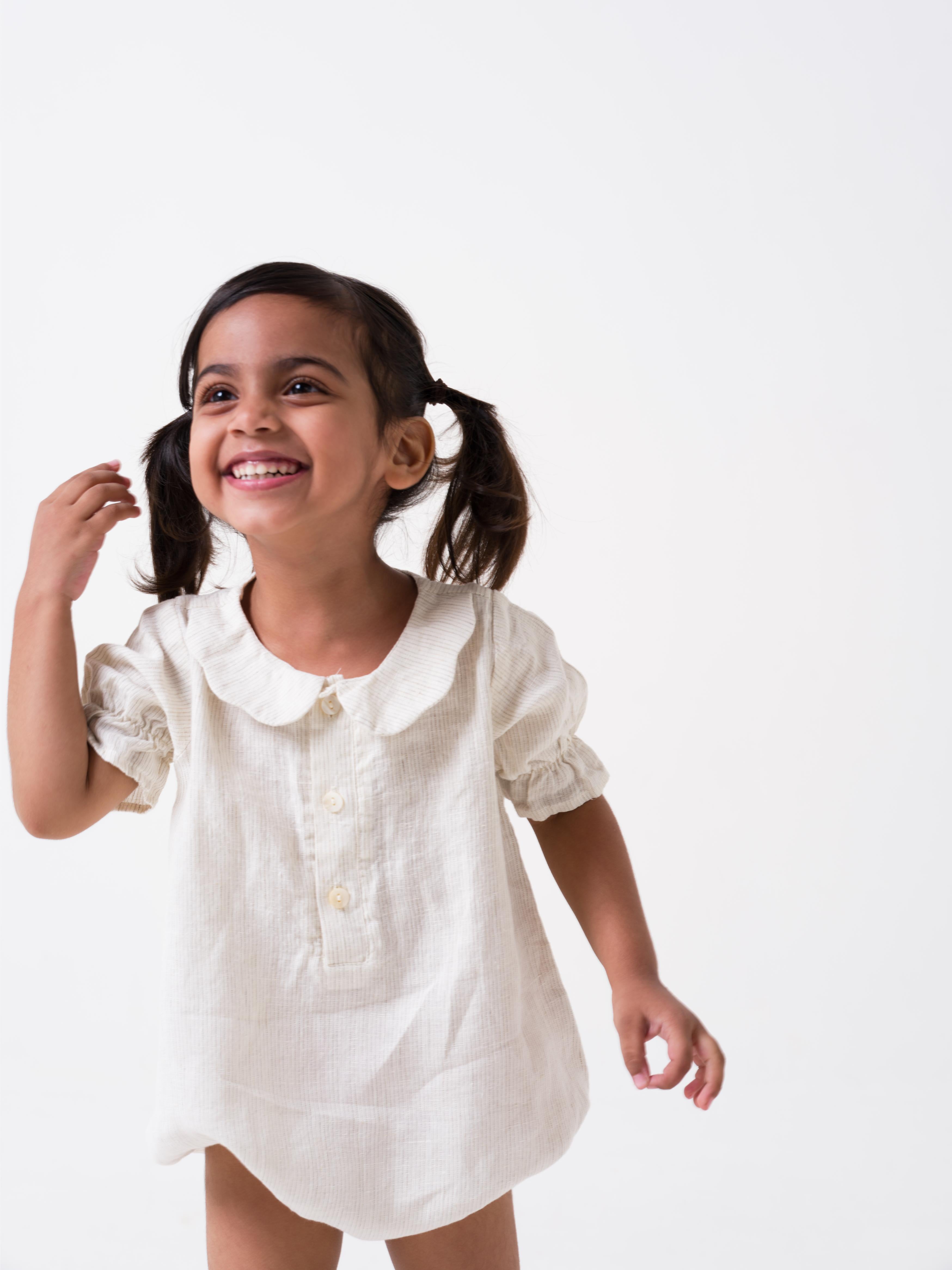 Puff Sleeve Romper - Beige Hairline Stripe